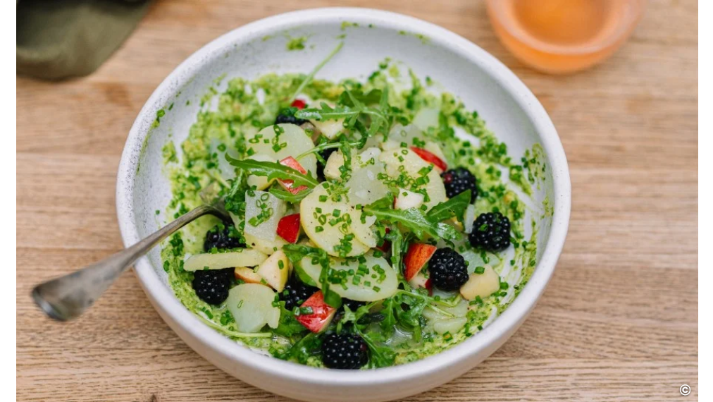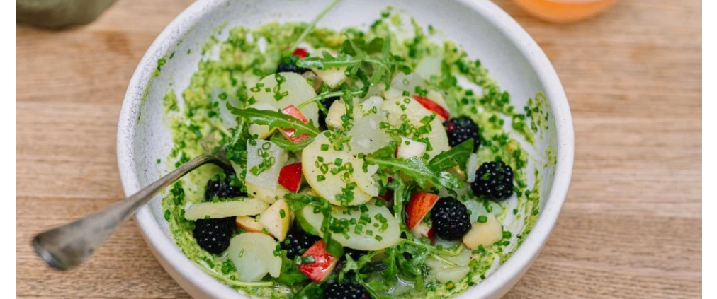 Lauwarmer Kartoffelsalat mit Brombeeren, Apfel & Rucola