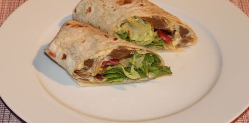 - Tortillas mit Hummus bestreichen und mit Salat, Zwiebeln, Tomaten und Seitan füllen