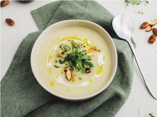 - Die Suppe mit Salz und Pfeffer würzen und mit etwas Sahne verfeinern. Heiß servieren und mit Kresse Schnittlauchröllchen und gerösteten Mandeln garnieren.