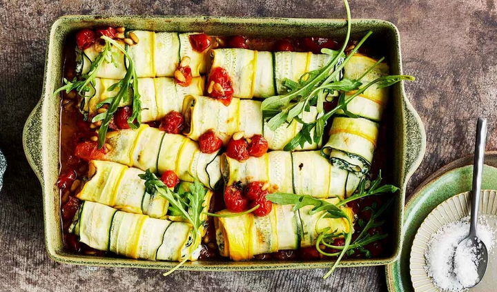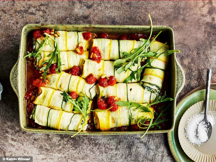 Je drei Scheiben Zucchini leicht überlagernd nebeneinanderlegen, je zwei EL Füllung darauf verteilen. Zucchini aufrollen und nebeneinander in die Auflaufform mit der Tomatensoße legen.